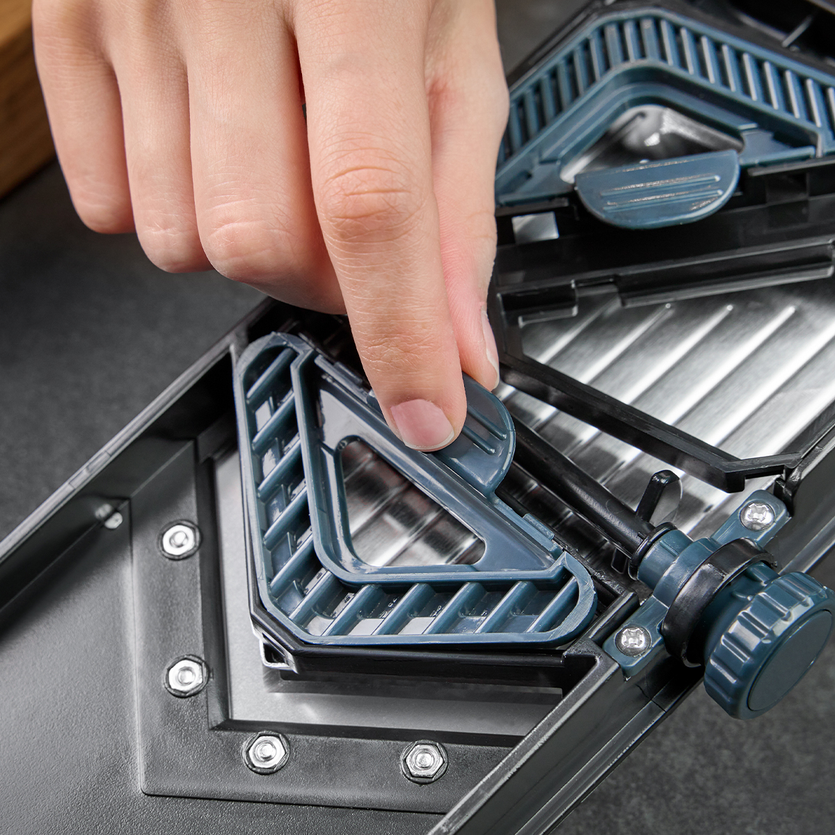 Pratik tava desteği ve kaymaz ayaklar dilimleyiciye güvenli bir tutuş sağlarken, atık tutucu güvenli bir çalışma sağlar.
