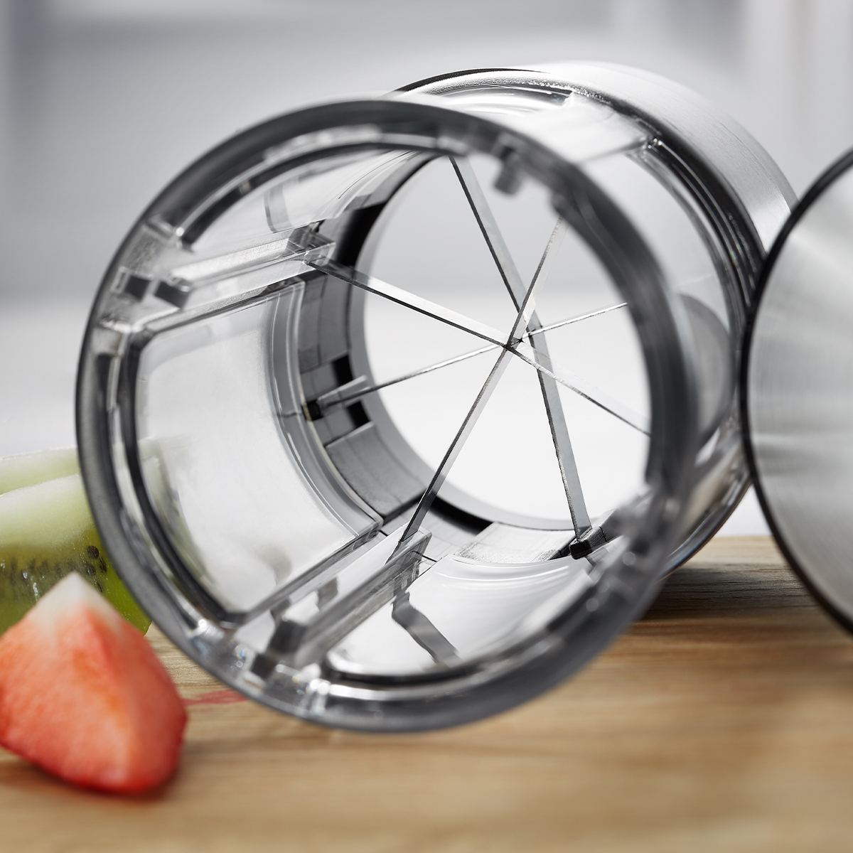 Yiyecekleri ihtiyaçlarınıza göre dörde veya sekize bölebilir. İstediğiniz boyutu ayarlayın, meyve veya sebzeyi açıklığa yerleştirin ve piston yardımıyla kesme borusundan geçirin.