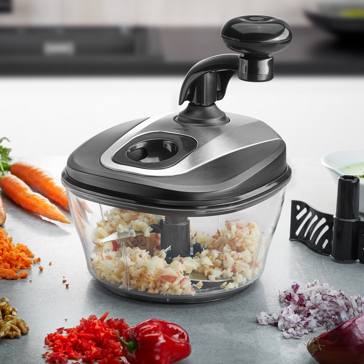 Spino doğrayıcı, 1500 ml'lik büyük bir kap ve kullanışlı bir krank ve besleme ağzı bulunan bir kapaktan oluşur.