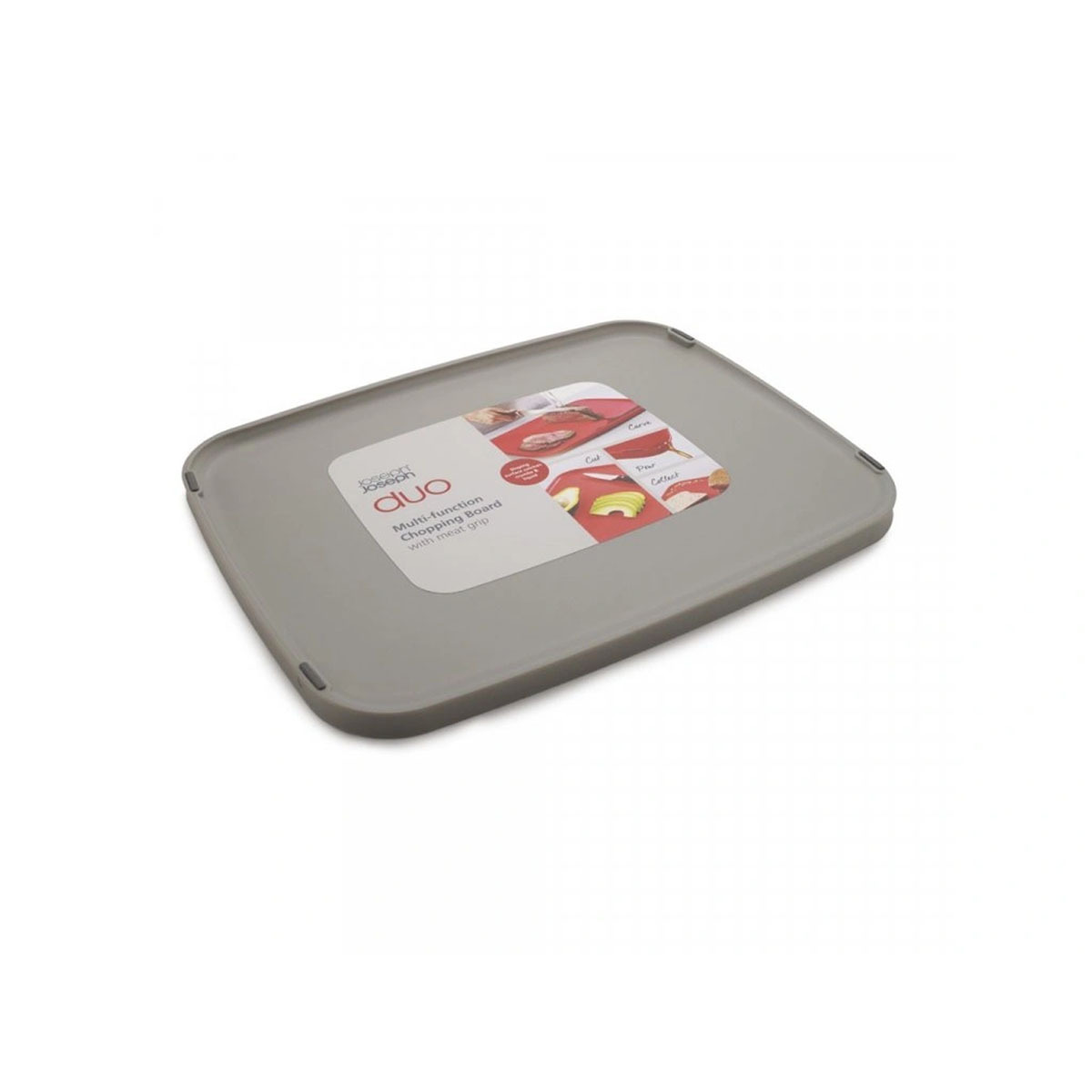 Gelince Haber VerÇift taraflı çok işlevli kesme tahtası Joseph Duo. Sıvının arka kenara akması için kesme yüzeyinin eğimi, bir tarafı pürüzsüz, diğer tarafı et keserken denge için kaymayan iğne benzeri çıkıntılarla.