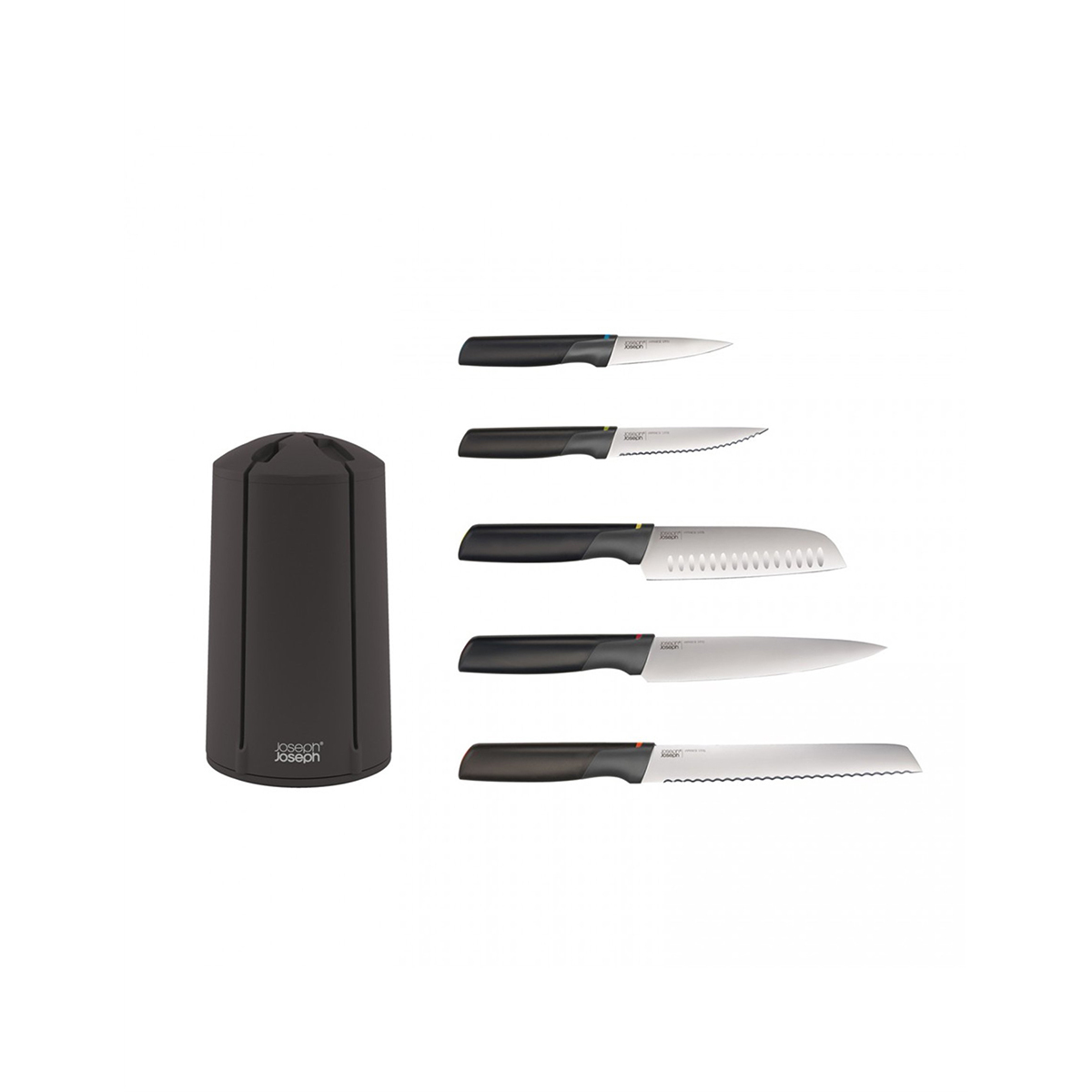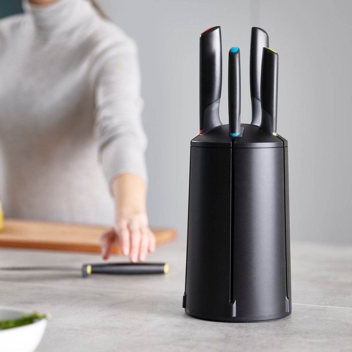 Bıçak bloğu kolay seçim için döner ve bir dolabın altında saklansa bile her bıçağı çıkarmayı kolaylaştıran dikey yuvalara sahiptir.