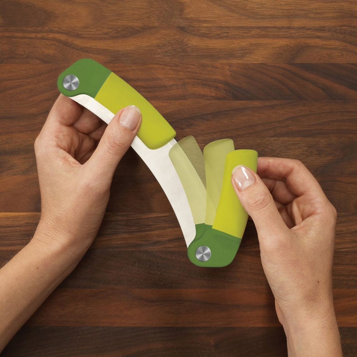 Katlanır sapları ve keskin paslanmaz çelik bıçağıyla otları ve sarımsağı ekonomik doğrar.