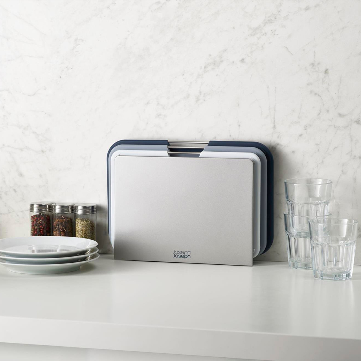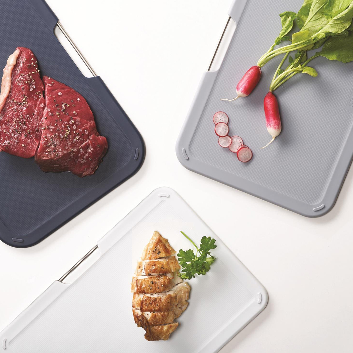 Her bir tahta, çeşitli gıda hazırlama görevleri için farklı boyutlardadır ve kolay kaldırılabilir paslanmaz çelik çubuk, kaymaz ayaklar ve dokulu kesme yüzeyine sahiptir.