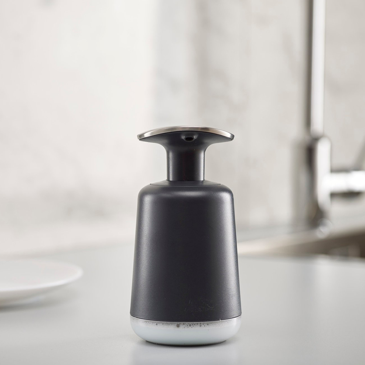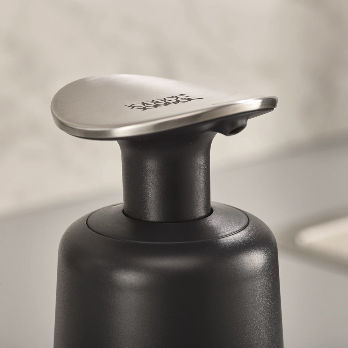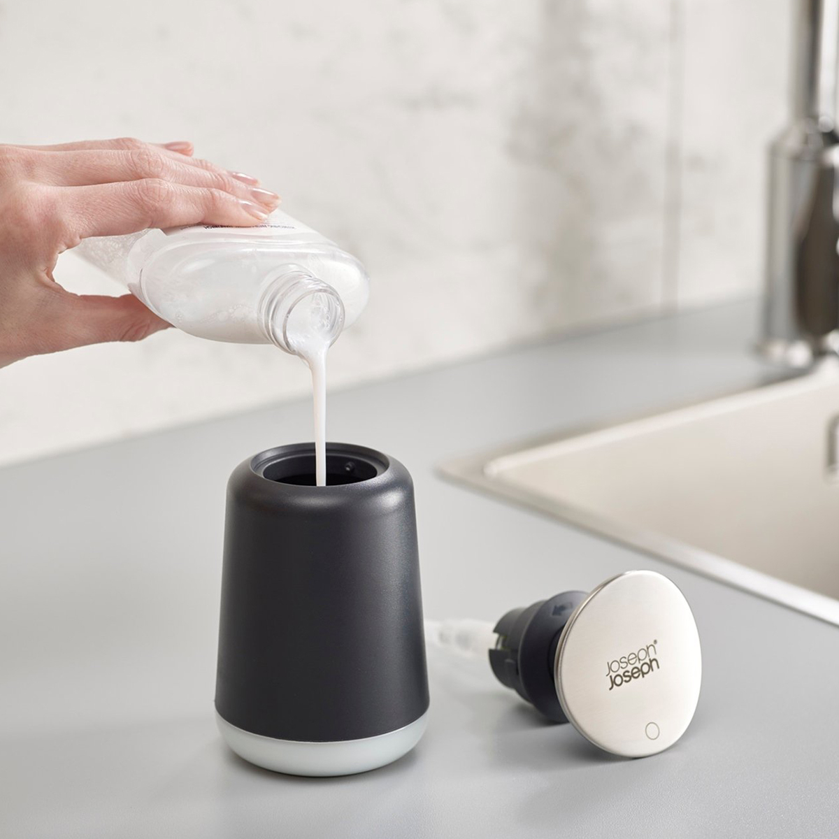 Gelince Haber VerBu hijyenik sıvı sabunluk, elleriniz kirliyken bileğinizle veya ön kolla kontrol etmenizi kolaylaştıran ekstra büyük, paslanmaz çelik bir pompa kafasına sahiptir.