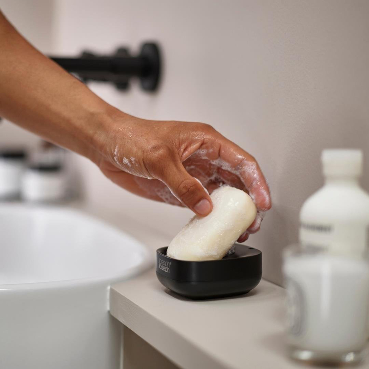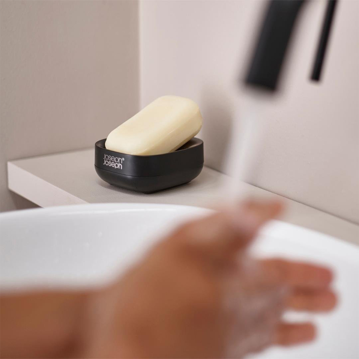 Gelince Haber VerJoseph Joseph, Mat Siyah Slim Compact Sabunluk'u sunuyor. Akıllı tasarımı, yerden tasarruf sağlamakla kalmayıp aynı zamanda fazla su ve köpüğün tabana akmasını da kolaylaştırarak sabunun ıslanmasını önlemeye yardımcı oluyor!