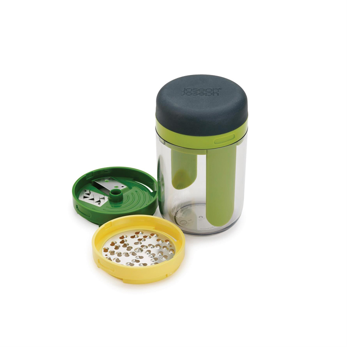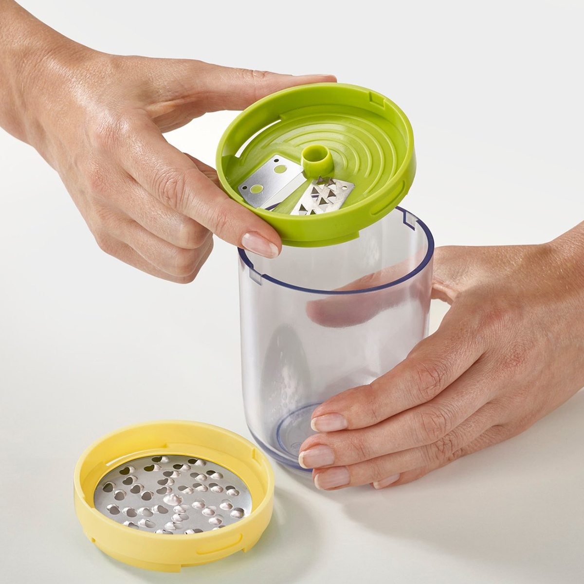 Yumuşak yüzeyli kapağı kolay kavranır, iki kılavuz koluyla da sebzeyi dik tutar.