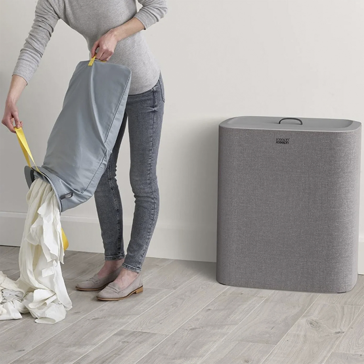 Joseph Joseph 3 Bölmeli Çamaşır Sepeti, her odaya mükemmel uyum sağlayan elegant Gri renk seçeneğiyle dikkat çeker. Şık ve modern tasarımıyla evinizin dekorasyonuna zarif bir dokunuş ekler.