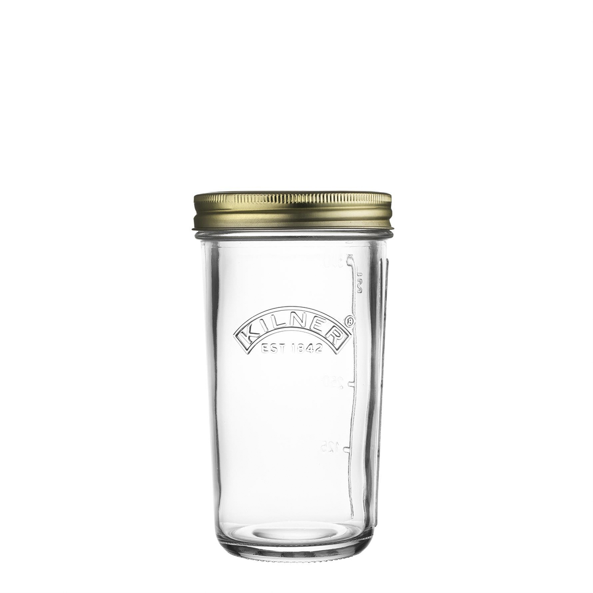 Kavanozun yan tarafında kabartmalı ML hacim göstergeleri bulunur ve ön tarafında kabartmalı Kilner logosu yer alır.