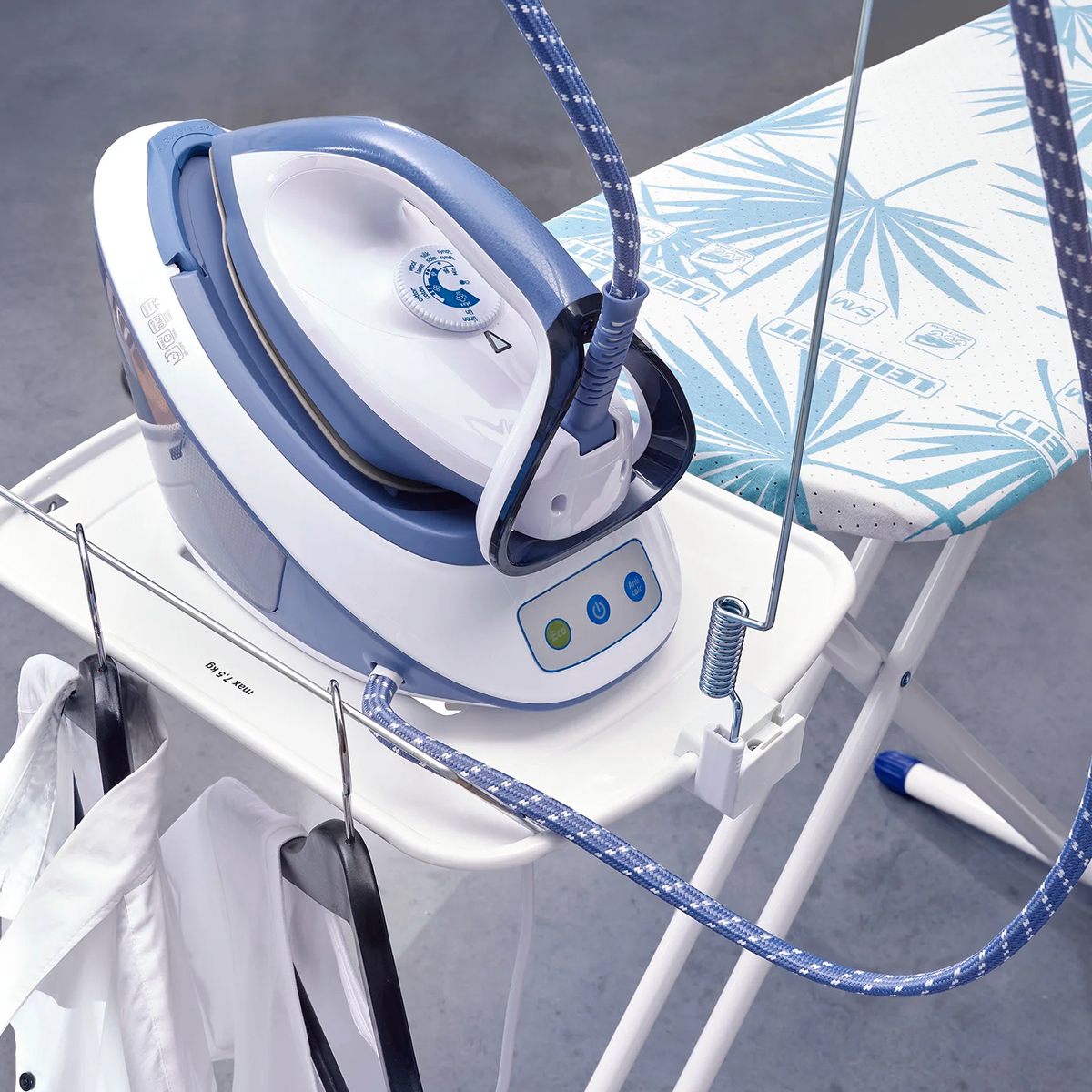 Gömlekler veya ceketler ütülemeden sonra tepsideki elbise askısı tutucusuna asılabilir. Ütüleme işleminizi elektrik kablolarının engellemesini önlemek için bir kablo tutucusu içerir. Şık avuç içi tasarımına sahip ütü masası kılıfı ile.