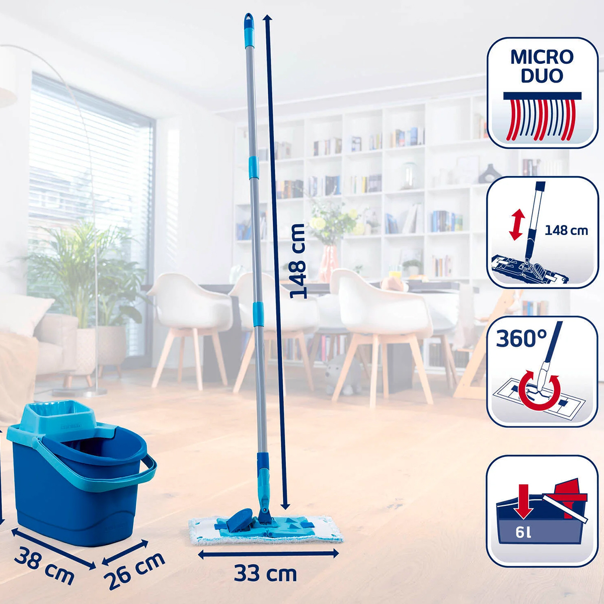 Tam set: Mikro duo silecek kılıfı, 6 litre hacimli kova (10 litre kapasite) ve sıkacağı içeren zemin sileceği