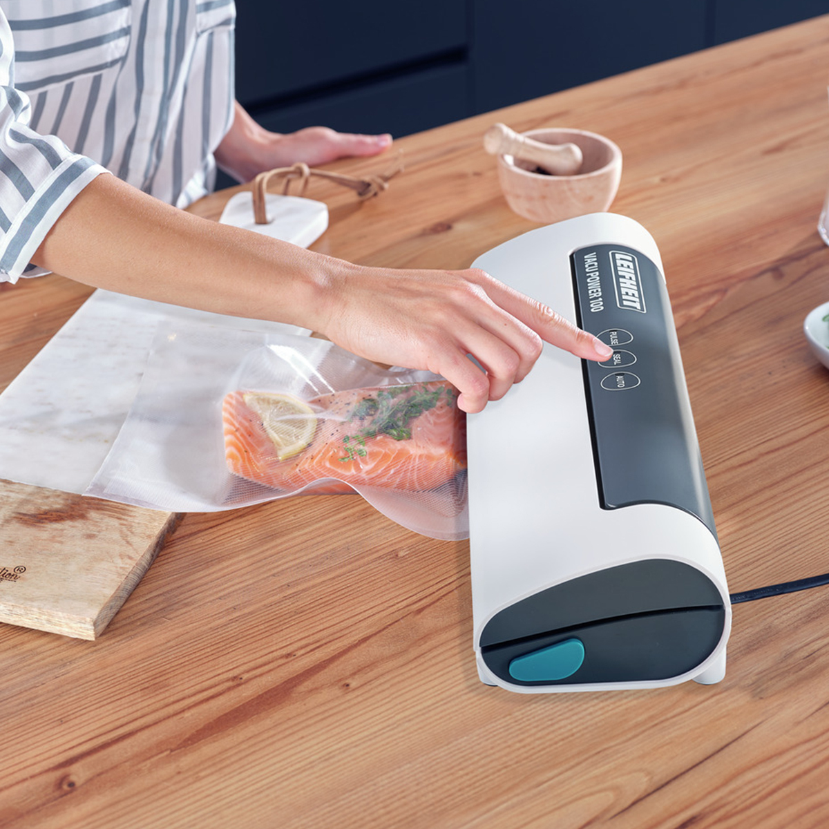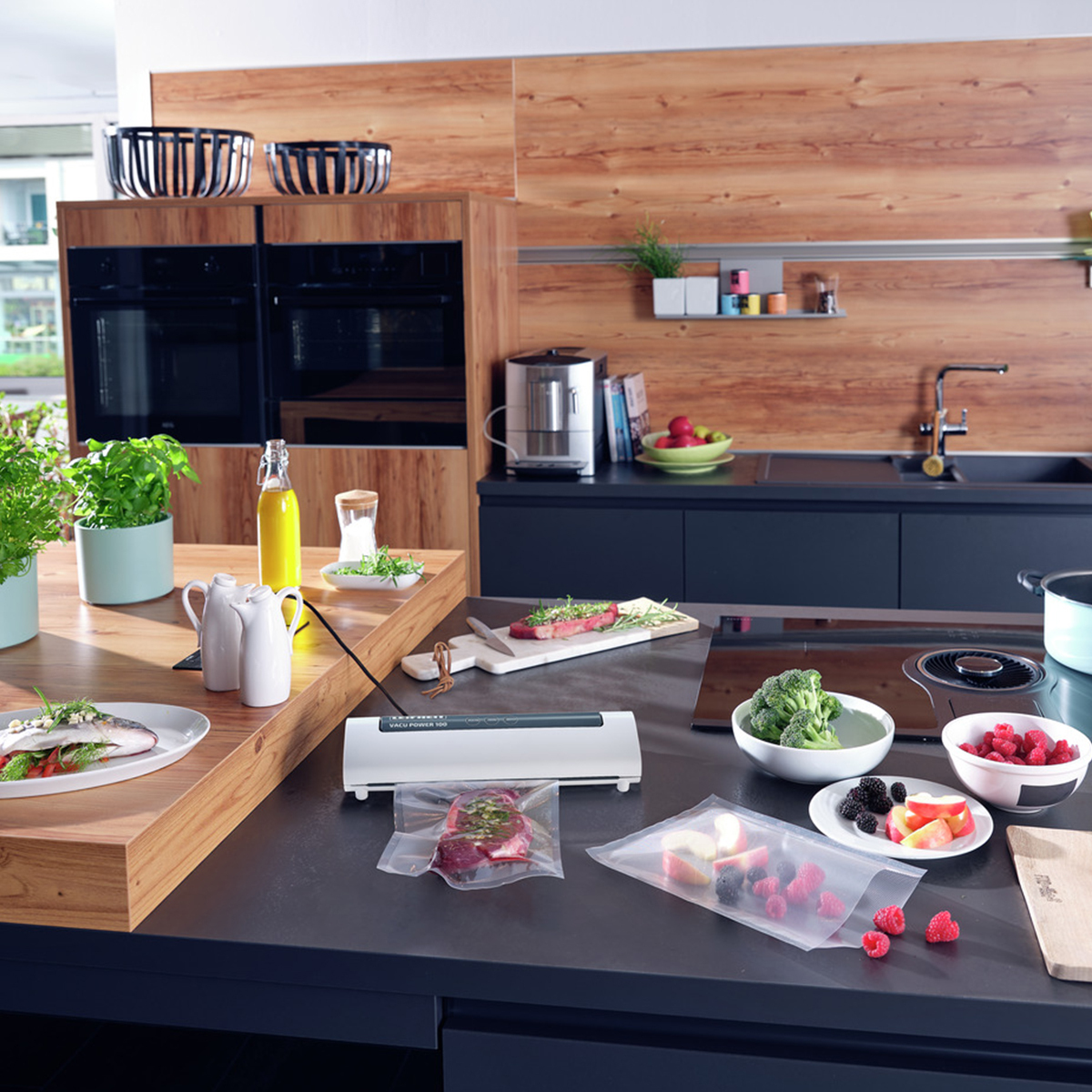 Vacu Power 100 vakum kapatma makinesiyle yiyecekler tamamen doğal ve koruyucu madde olmadan 8 kata kadar daha uzun süre taze kalır.