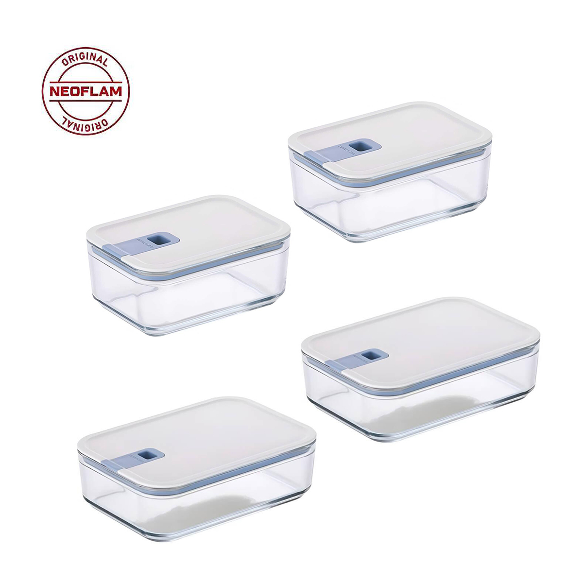 Neoflam Perfect Seal dikdörtgen cam saklama kabı, mükemmel tasarımı ve 400 derece ısıya dayanıklı borosilikat cam gövdesi ile yiyeceklerinizi uzun süre ilk günkü tazeliğinde korur.