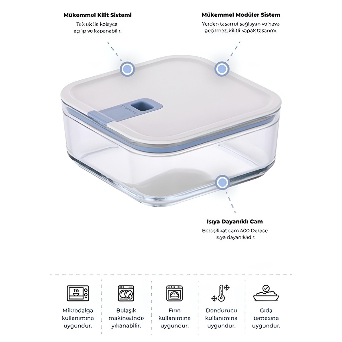 Mükemmel hava mührü ve koruması sağlayan tasarımı ile buzdolabından, derin dondurucuya kadar saklama imkanı sunarken, borosilikat malzemesinden üretilen gövdesi ile normal fırın ve mikrodalgada yiyeceklerinizi ısıtma imkanı sunar.