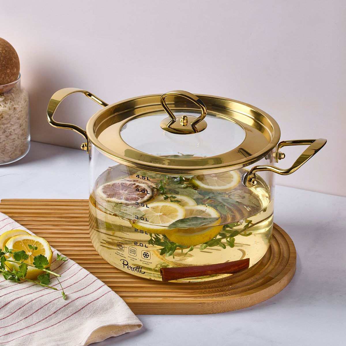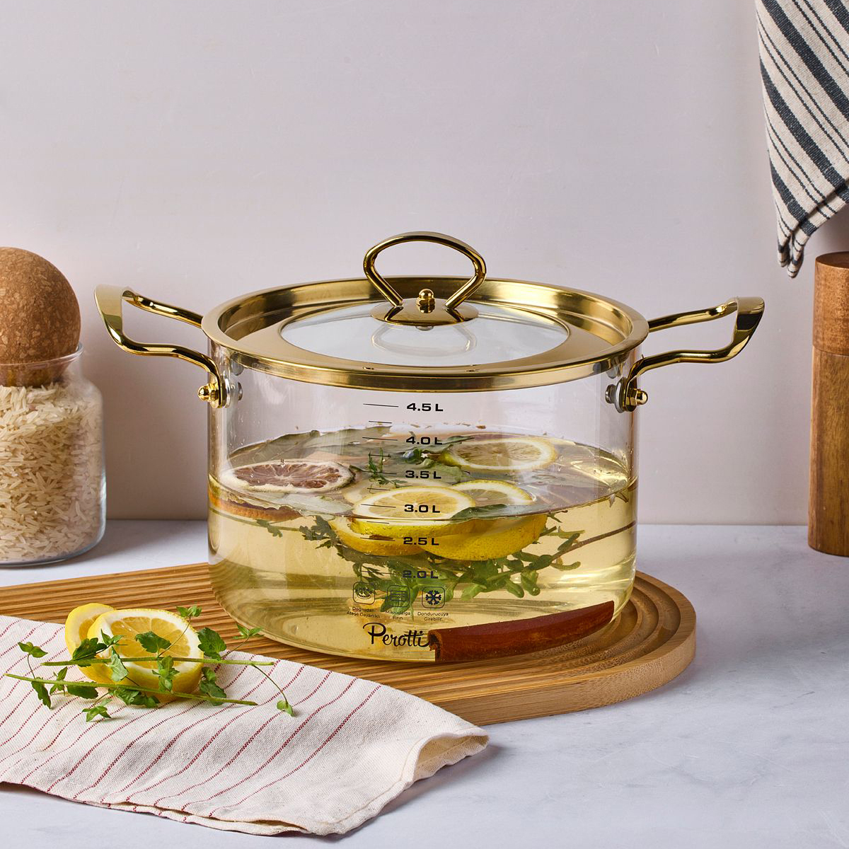 Gelince Haber VerŞeffaf camın zarif görünümü gold detaylarla buluşturan Perotti Logan Gold Cam Tencere, 4,5 litrelik kapasitesiyle mutfakta hem estetik hem de işlevsel bir kullanım sunuyor.