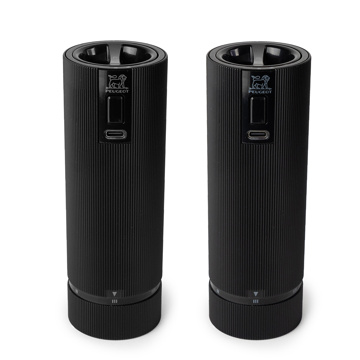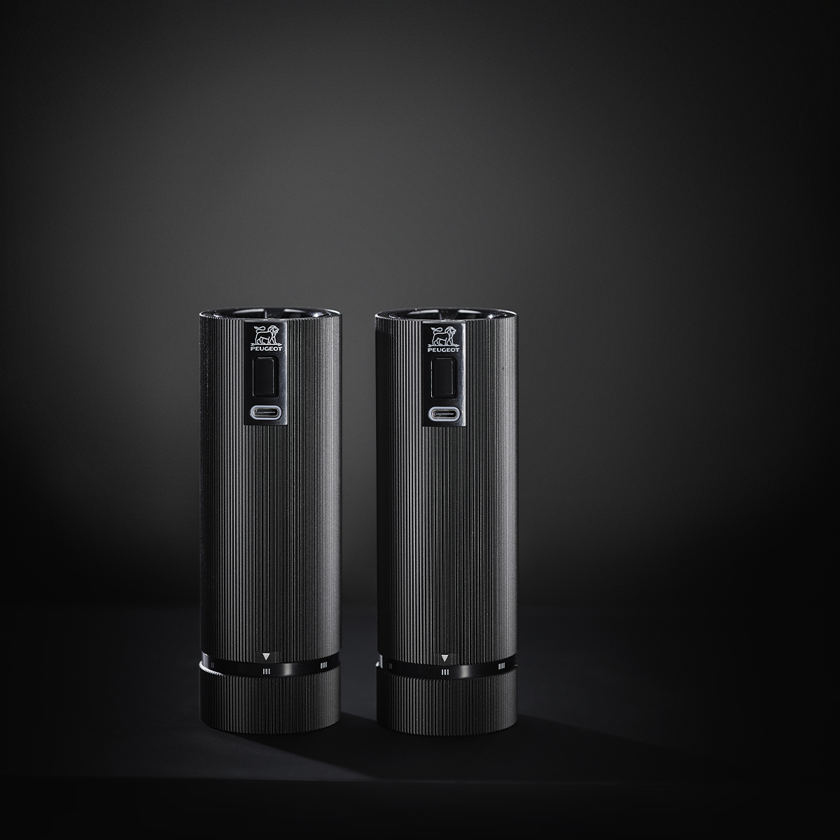 Mat siyah nervürlü alüminyumla kaplı bu 15 cm'lik Line elektrikli değirmenler , doldurmadan kullanıma kadar şıklık ve yaratıcılığı bir araya getiren nadir bir zarafet sergiliyor .