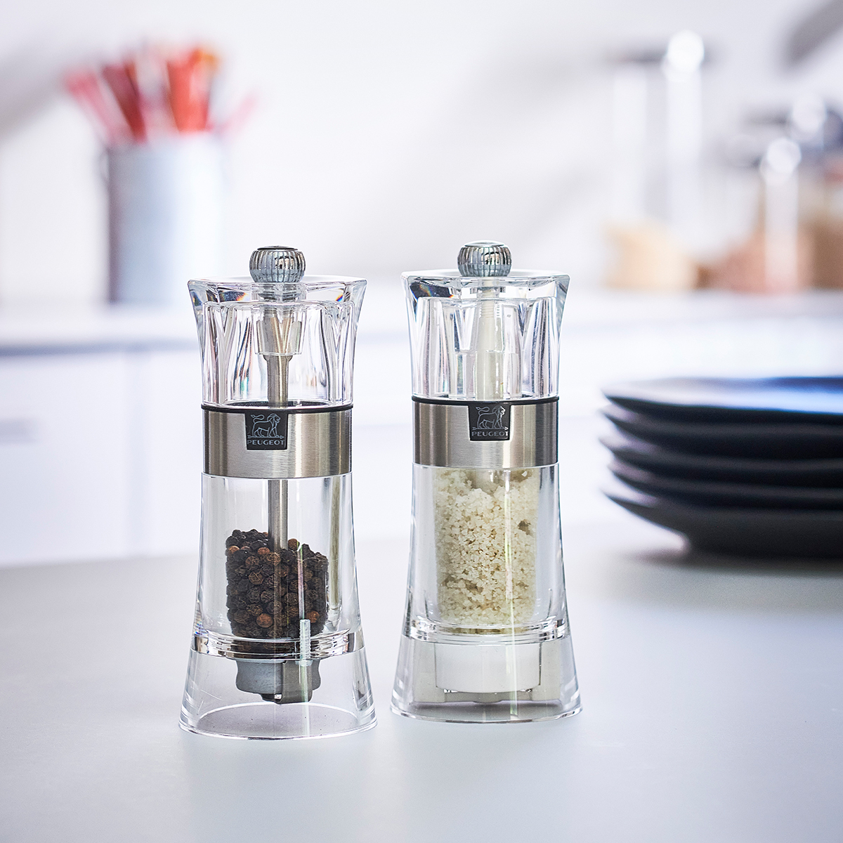Gelince Haber VerOslo koleksiyonundan manuel öğütme mekanizmalı bir dizi Peugeot biber ve tuz öğütücü.