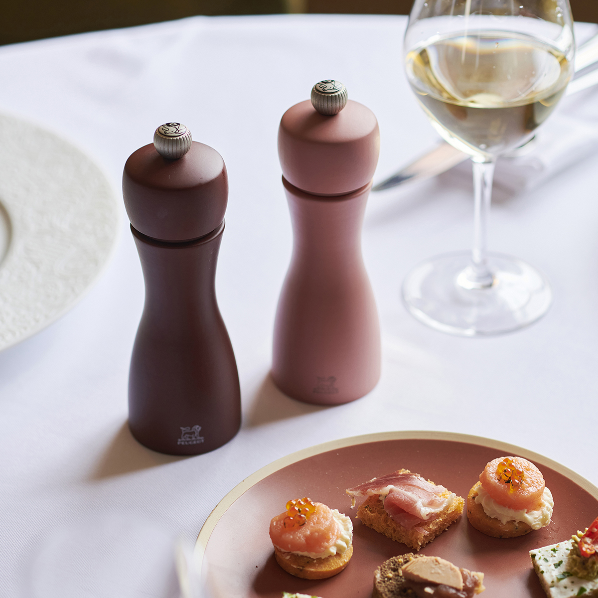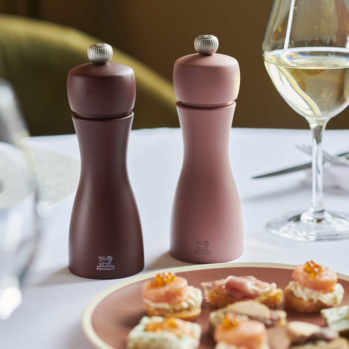 Karabiber değirmeni kahve rengiyle, tuz değirmeni ise tatlı pralin rengiyle öne çıkıyor. Fransa'da üretilen bu değirmenler sınırsız garantili öğütme mekanizmasıyla donatılmıştır.