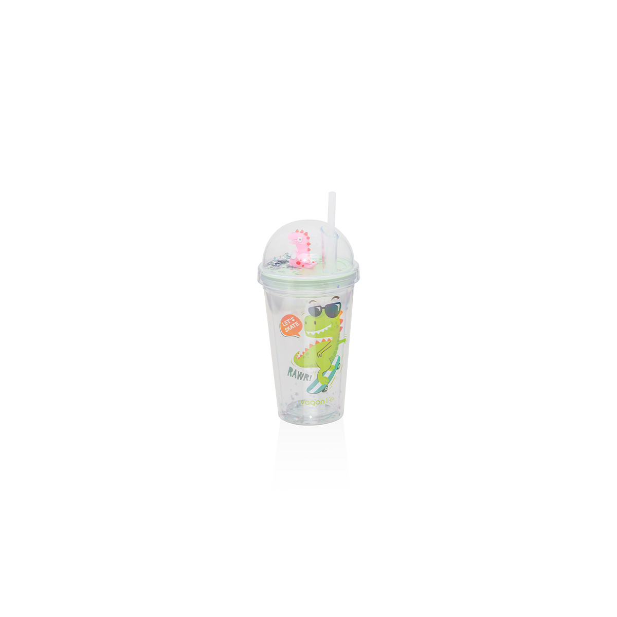Bu çift cidarlı plastik pipetli meşrubat bardağı, eğlenceli figürlerle süslenmiş ve su sızdırmaz tasarımıyla dikkat çeker.