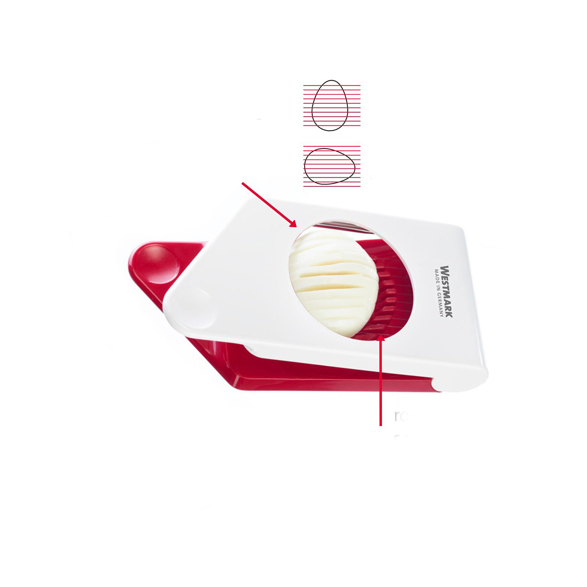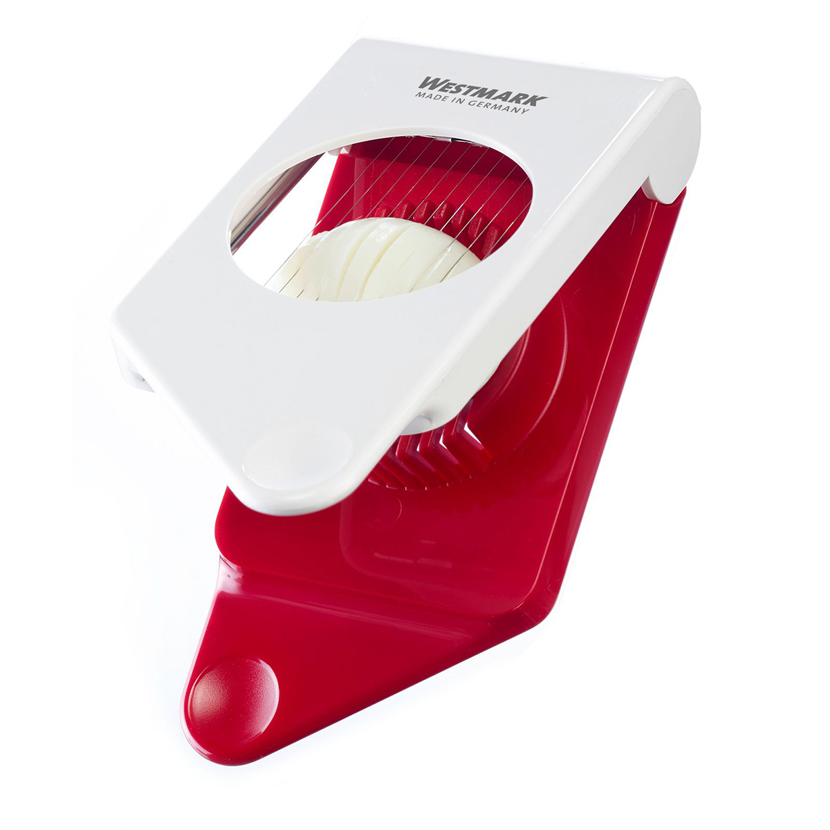 Sıkıca gerilmiş paslanmaz çelik teller, haşlanmış yumurtaları sarısını kırmadan temiz yuvarlak veya oval dilimler halinde keser.