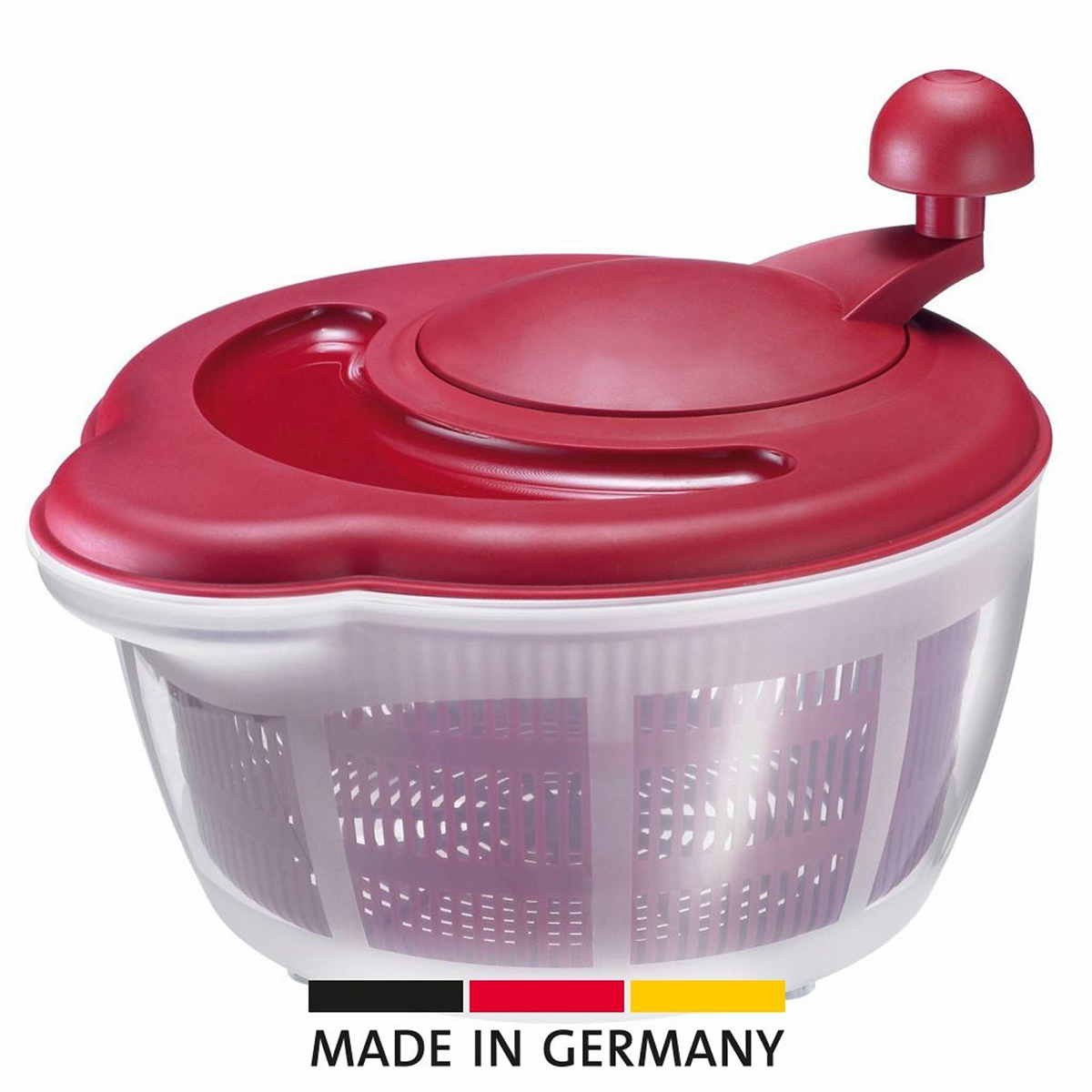 Ergonomik düğmeyi hızlıca çevirerek durulanmış yeşillikleri süzgeçte döndürüp kurutun.