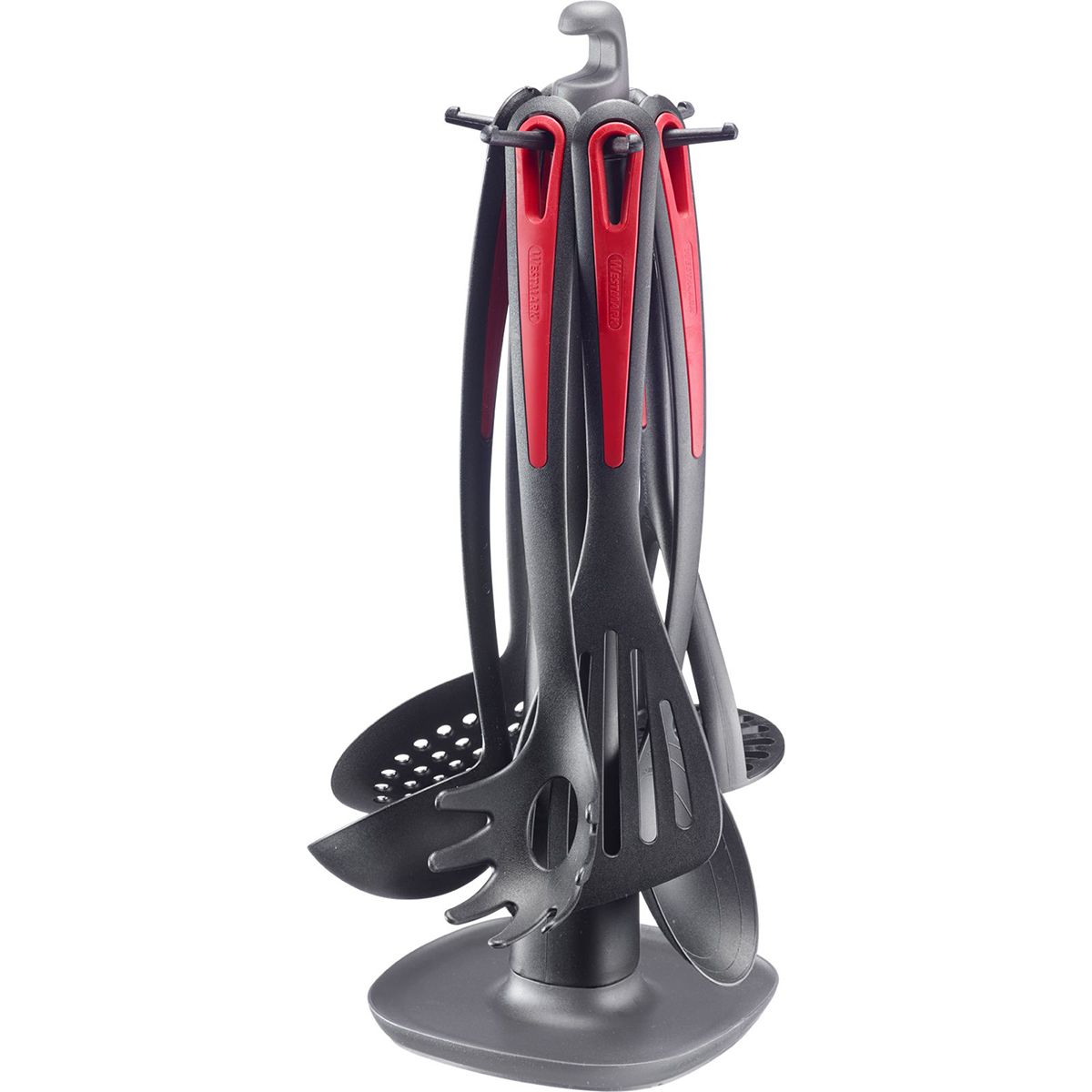 Set, bir patates ezici, bir kızartma kaşığı, bir sebze kaşığı, bir spagetti kaşığı, bir çorba kepçesi, bir delikli kaşık ve bir spatula içerir; yani yemek pişirmek ve hazırlamak için ihtiyacınız olan her şey.