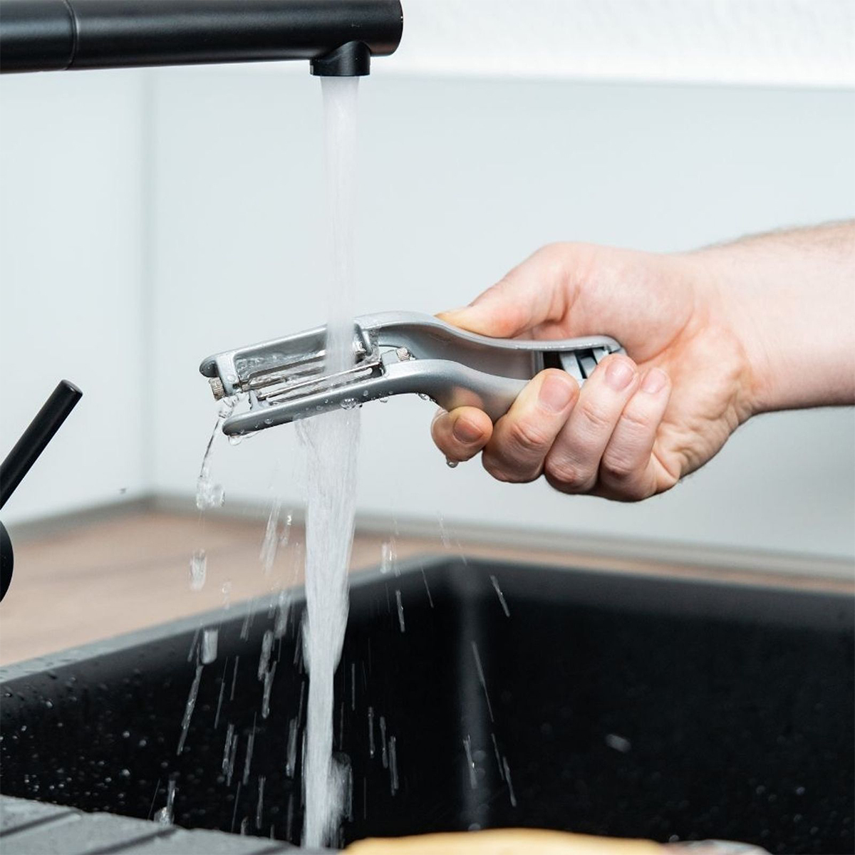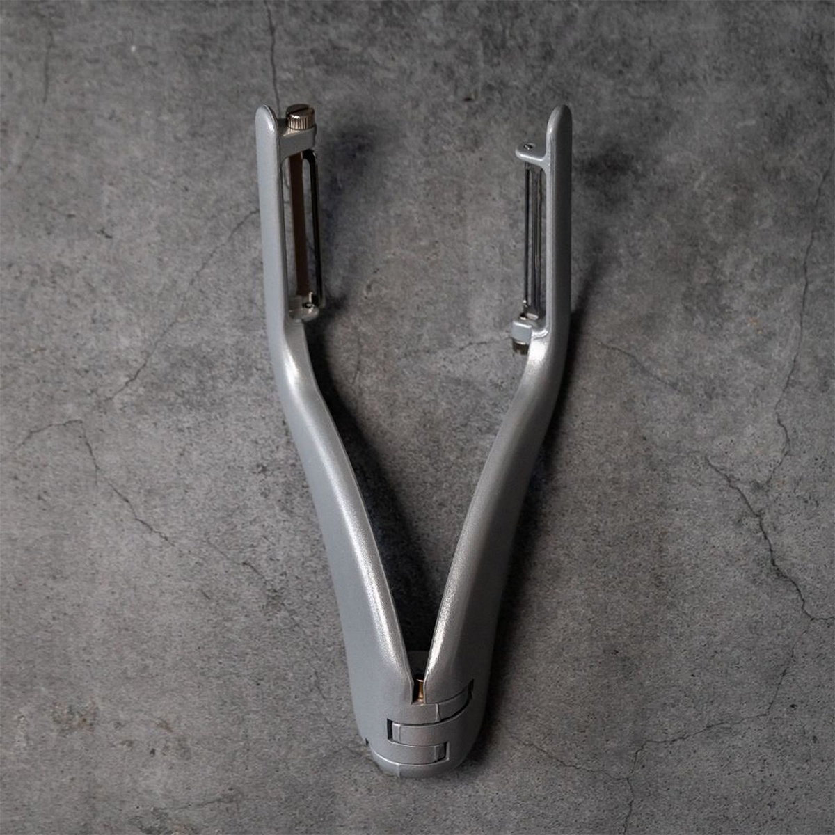Peel-Star Alu çift soyucu, kuşkonmaz, havuç, kabak ve salatalık gibi uzun sebzeleri anında soymak için zıt yönlerde iki bıçak kullanır.